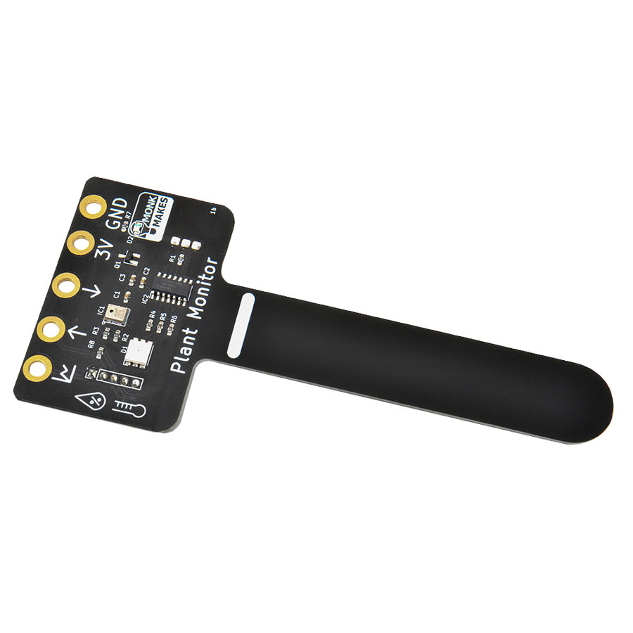 The MonkMakes Plant Monitor Board is a capacitive moisture probe/meter with additional built-in temperature and relative humidity measurement. It is compatible with micro:bit, Raspberry Pi, Arduino, Pico, and most other microcontroller boards.