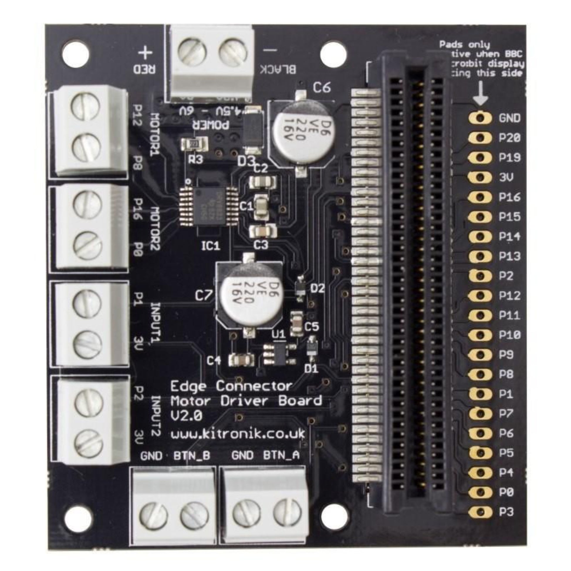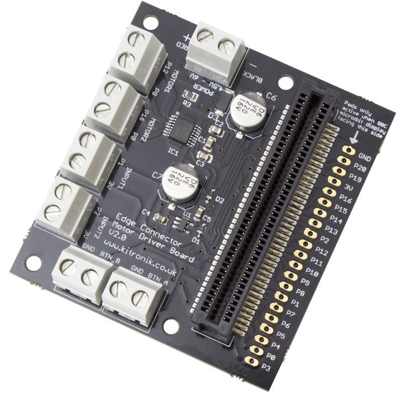 This motor driver for the micro:bit includes an integrated Edge Connector slot for your micro:bit to easily slot into. It also features external connections to the A and B buttons/inputs. This allows additional switches to be connected to the motor driver board and the state of these can then be read by the micro:bit.